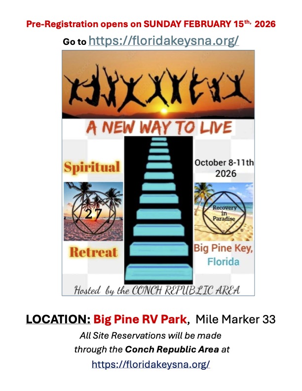 The Conch Republic Area spans 126 miles, 100 islands and 42 bridges! There are over 25 meetings a week, 8 groups and on some days up to 6 meetings per day to choose from. Our NA community is as diverse and as colorful as the Islands themselves! We can start our day with a morning meeting on the beach looking out over the Atlantic Ocean 90 miles toward Cuba, or end our day with the Clean Conchs in Key Largo!